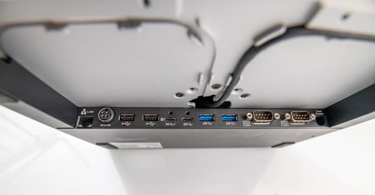 In der VESA-Variante der POS 7 Mini lässt sich die Systembox individuell je nach Anforderung unter einer Theke montieren oder an einer Wand anbringen. Dadurch bietet sich auch die Möglichkeit für eine Pole- oder Wandmontage des Bedienerdisplays und erleichtert das Kabelmanagement.